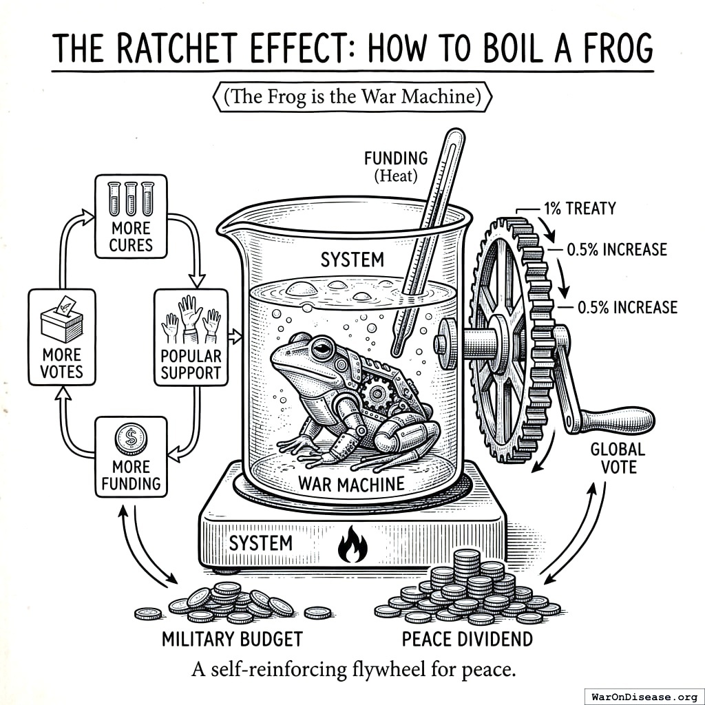 More cures lead to more popular support. More bondholder income leads to more political pressure. More treaty funding leads to more campaign support for yes-voting politicians. Three ratchets, one direction. The endgame: countries bragging about their cancer survival rates instead of their missile counts.