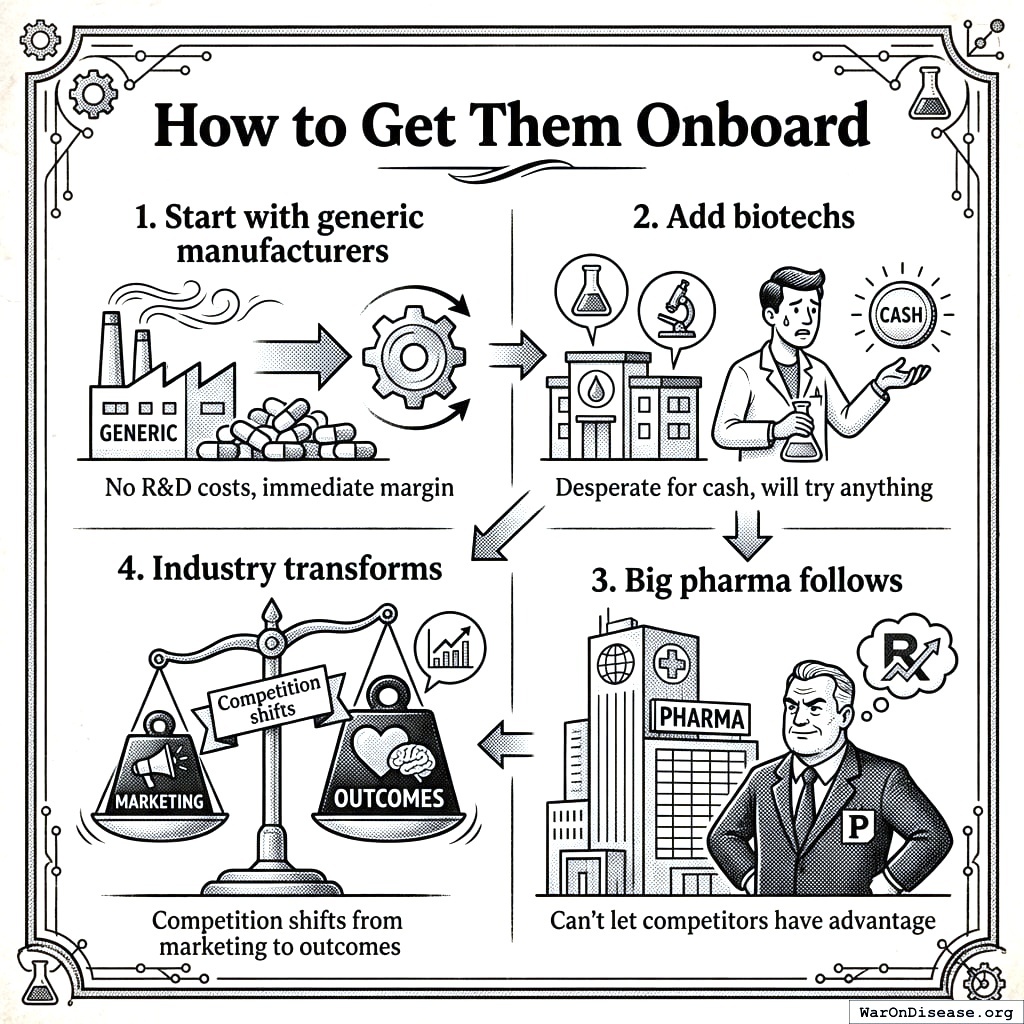 You start with generic manufacturers, who have no R&D costs and immediate margin. Then you add biotechs, who are desperate for cash and will try anything (desperation is the mother of innovation on your planet; this is not how it should work, but it’s how it does work). Then big pharma follows, because they can’t let competitors have the advantage. Then the industry transforms and competition shifts from marketing to outcomes. This is the same adoption curve as every technology your species has ever adopted: small, desperate, competitive, universal. It took seven years for smartphones. It took twelve years for social media. It should take less for something that cures disease, but your species has consistently demonstrated that it adopts entertainment faster than medicine, so add a few years for that.