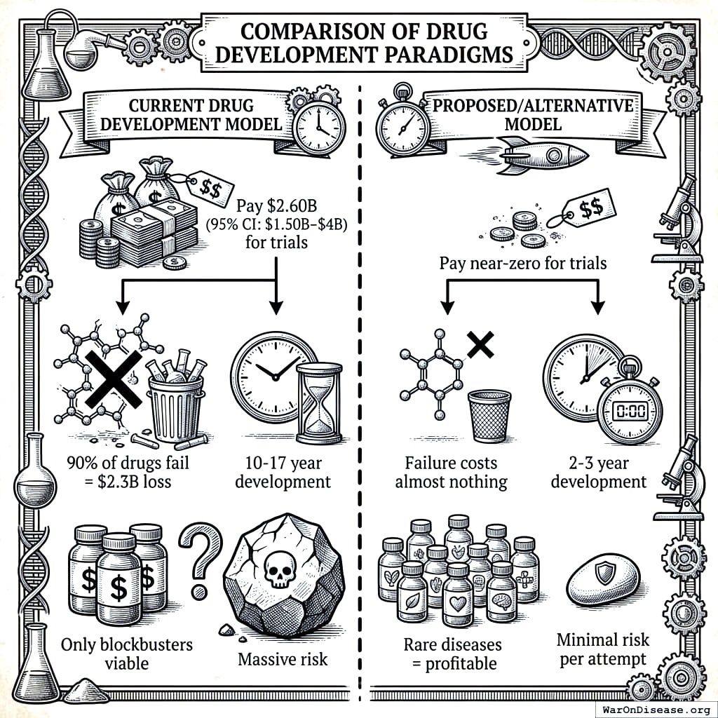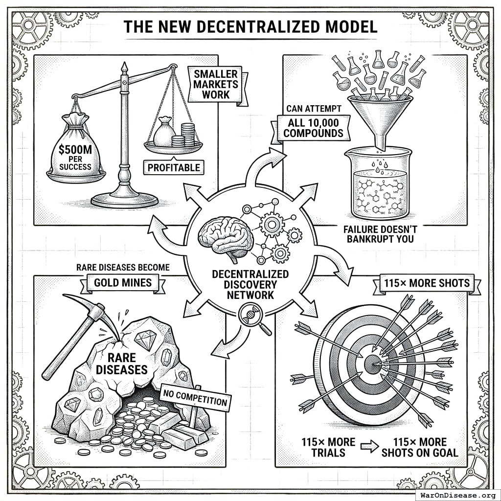 Lower revenue per drug, but massively more attempts. Currently they target $1B+ blockbusters only, make approximately 10 attempts per year (each costing $2.6B), ignore rare diseases entirely, and have limited capacity. Under the decentralized model, $500M per success becomes profitable, they can make thousands of attempts (because failure doesn’t bankrupt you), rare diseases become gold mines with no competition, and capacity increases by 12.3x.