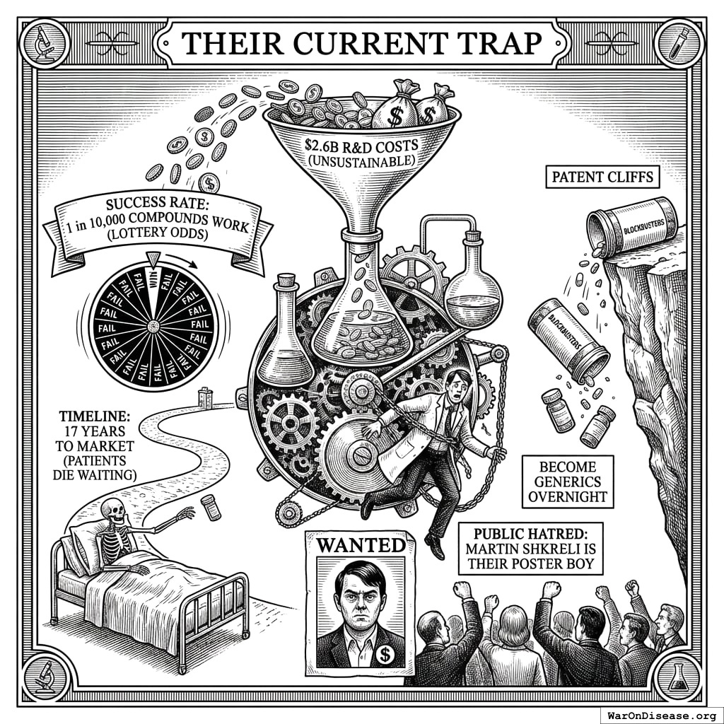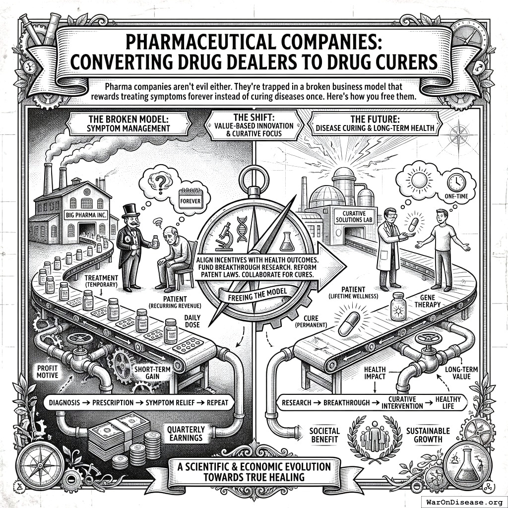 Pharma companies aren’t evil. They’re just doing what any rational organism does when you pay it to keep people sick: keeping people sick. They’re trapped in a business model that rewards treating symptoms forever instead of curing diseases once. This is like blaming a river for flowing downhill. The river isn’t evil. The river is just going where gravity takes it. If you want it to go somewhere else, you don’t lecture the river. You move the landscape.