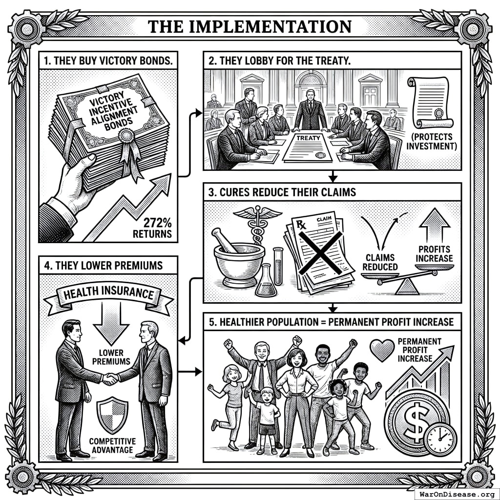 The implementation: they buy VICTORY Incentive Alignment Bonds (272% returns), they lobby for the treaty (which protects their investment), cures reduce their claims (which increases their profits), they lower premiums (which gives them competitive advantage), and a healthier population produces a permanent profit increase. Each step makes the next step more profitable. It’s a virtuous cycle, which is like a vicious cycle but nobody dies. Your species has built many vicious cycles. This would be your first virtuous one, which is a statistic that should embarrass you more than it apparently does.