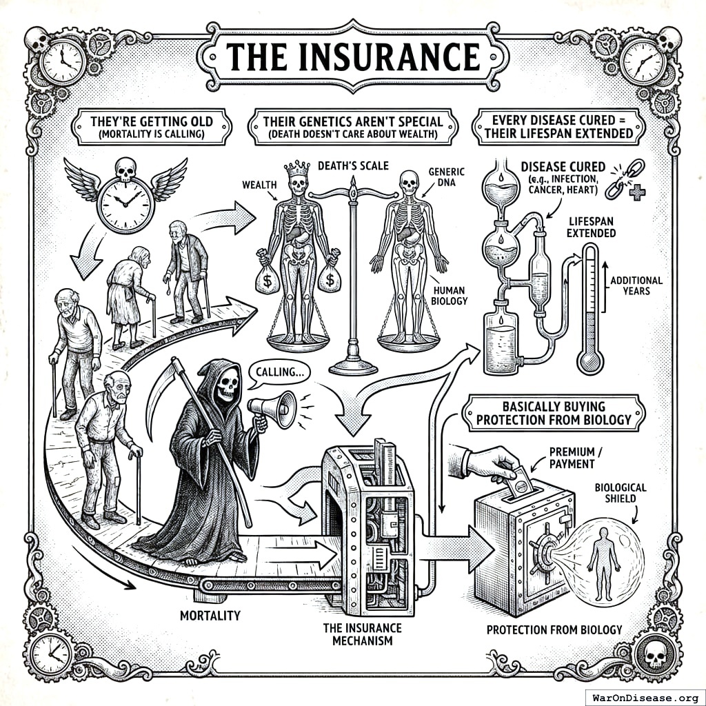 The package: VICTORY Incentive Alignment Bonds funded by treaty revenue, beating traditional portfolio yields (returns). “The Gates Cancer Center” and a Nobel Peace Prize and history books reading “Funded the cure for death” (legacy). And the part they won’t say out loud but think every time their knee hurts: they’re getting old, their genetics aren’t special, and every disease cured is their lifespan extended (survival). Your species’ billionaires have been funding vanity projects for decades. Space tourism. Underwater hotels. Islands. None of these extend their lifespan. This does. It’s the first vanity project where the vanity is rational.