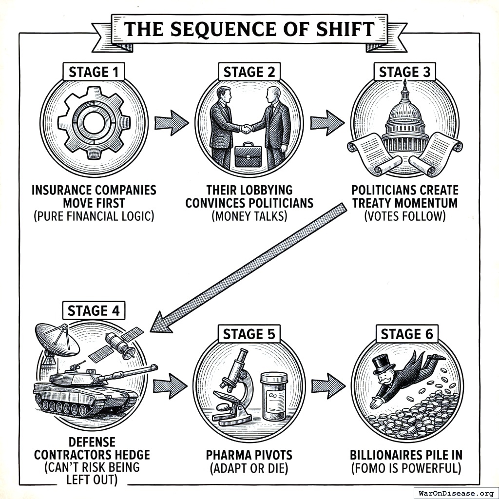 Insurance companies move first, because pure financial logic is their entire personality and curing disease reduces their costs. Their lobbying convinces politicians, because money talks and insurance money talks loudly. Politicians create treaty momentum, because votes follow money follows lobbying follows insurance follows actuarial tables, which is the most boring causal chain in history but also the most reliable. Defense contractors hedge, because they can’t risk being left out of a profitable shift. Pharma pivots, because adapt or die, which is ironic advice to give an industry that’s supposed to prevent dying. Billionaires pile in last, because FOMO is powerful in humans generally and devastating in billionaires specifically, who have built their identities around being first and cannot tolerate being last.