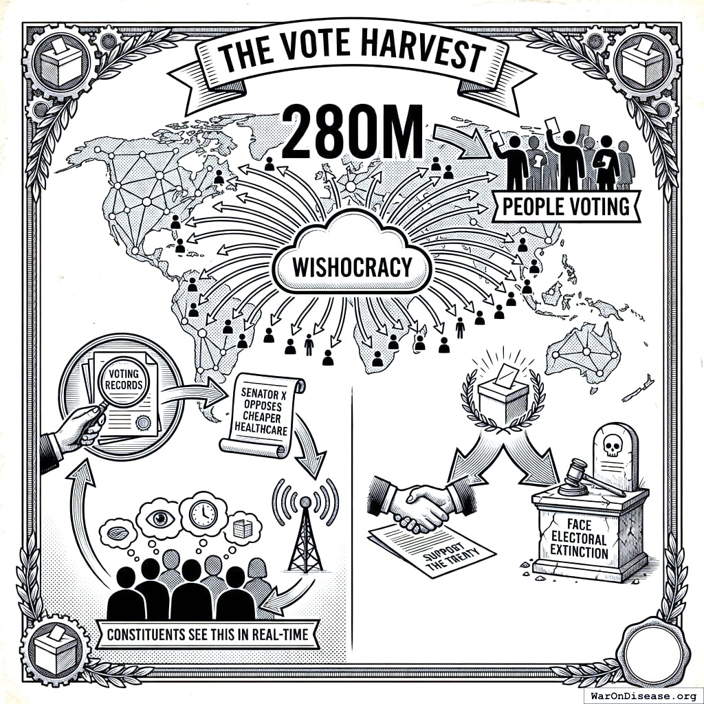 The vote harvest: 280 million people voting on Wishocracy141. You publish voting records (“Senator X opposes cheaper healthcare”). Their constituents see this in real-time. Support the treaty or face electoral extinction. This is democracy working as designed, which is so unusual that it will probably be reported as a threat to democracy, because on your planet, democracy working is considered a disruption to the normal functioning of democracy, which is not working.