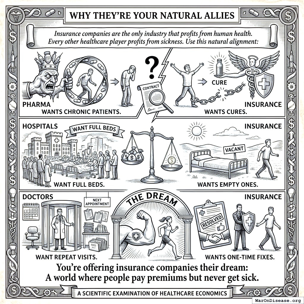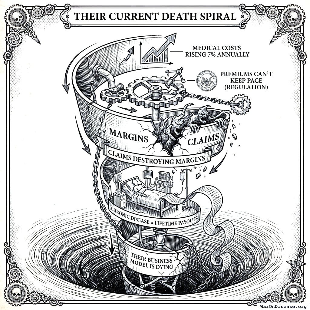 The math they can’t refuse: diabetes costs $327B annually, Alzheimer’s costs $355B, heart disease costs $363B, and cancer costs $208B. Cure any one of these and the ongoing savings are roughly 90%. They don’t need $0 costs. They just need costs to stop rising 7% annually. A cure does that. A cure is, from an actuarial perspective, the best thing that can happen to an insurance company. The second best thing is you dying quickly. The worst thing is you dying slowly and expensively, which is what your current medical system specializes in.