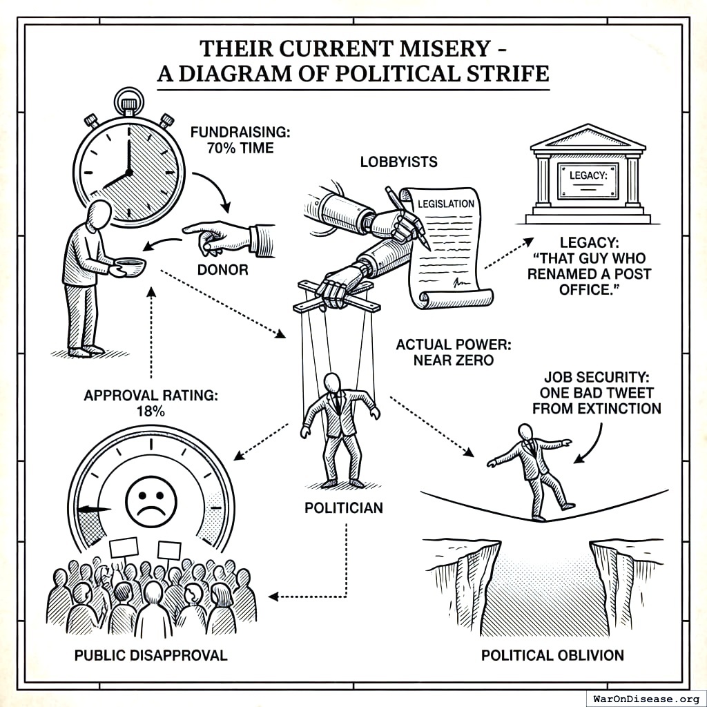 They spend 70% of their time begging for money, which leaves 30% for everything else, which is governing, but most of that 30% is spent on things that aren’t governing either, so the actual time spent governing approaches zero, which explains the quality of the governance. Their approval rating is 18%, which means 82% of the people they work for think they’re doing a bad job, which would get you fired in any other profession, but in politics it gets you re-elected because the other candidate has an 18% approval rating too, and the election is just a competition to see who is less disliked. Lobbyists write the bills. Donors set the agenda. The politician’s actual role is to stand in front of a flag and announce things that other people decided, which is called “leadership” on your planet and “puppetry” on mine.