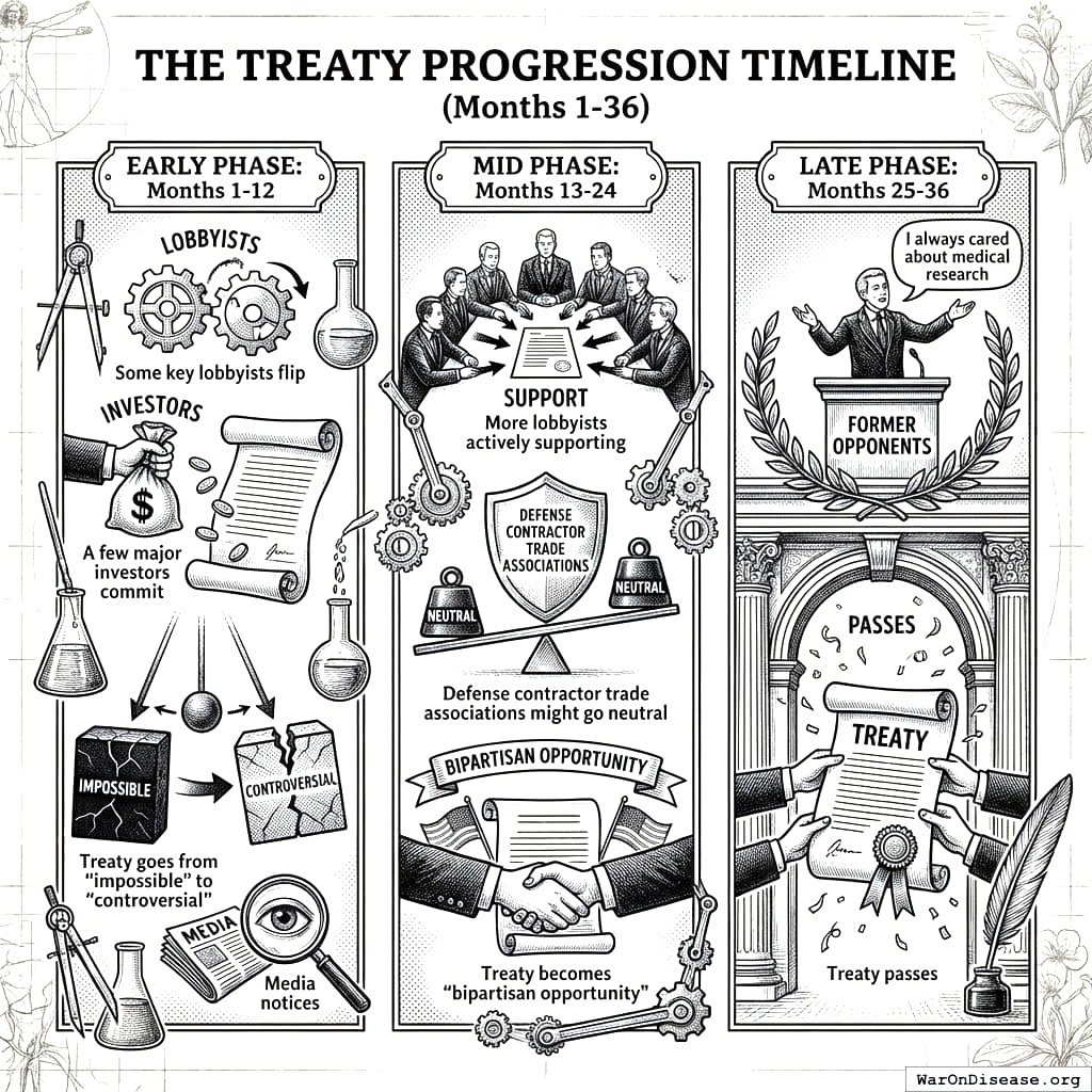 The money pipeline: support the treaty and Super PAC funds flow in. Oppose it and Super PAC funds flow to your opponent. This is how your political system already works, except currently the money flows from death manufacturers who want more weapons. You’re just adding a second faucet that flows from people who want fewer diseases. The politician doesn’t even need to change their behavior. They just need to notice which faucet has more water.