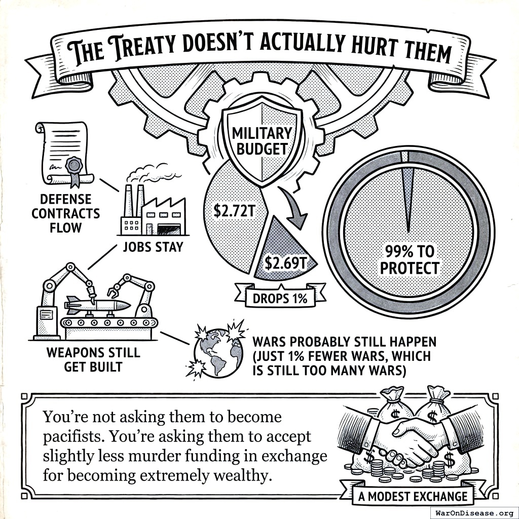 The treaty doesn’t actually hurt them. Military budget drops 1% (from $2.72T to $2.69T). They still have 99% to protect. Defense contracts still flow. Jobs stay. You’re asking them to accept slightly less murder funding in exchange for becoming extremely wealthy. This is not a hard sell. This is barely a sell at all. It’s more of a notification.