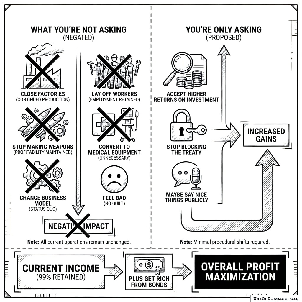You’re not asking them to close factories, lay off workers, stop making weapons, convert to medical equipment, change their business model, or feel bad about anything. You’re only asking them to accept higher returns on investment, stop blocking the treaty, and maybe say nice things about it publicly. They keep 99% of their current income PLUS get rich from bonds. This is the kind of negotiation where both sides win and one side doesn’t even realize it’s a negotiation. On your planet, this is called “a good deal.” On mine, it’s called “obvious.”
