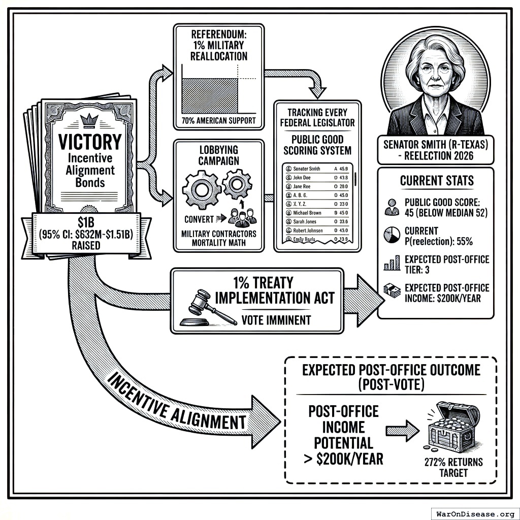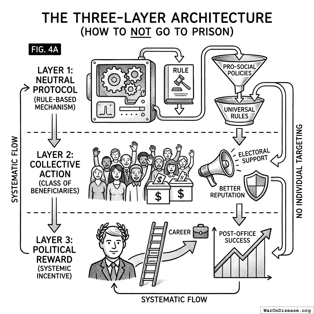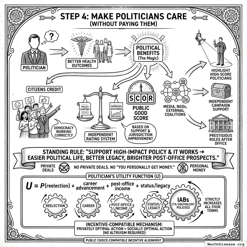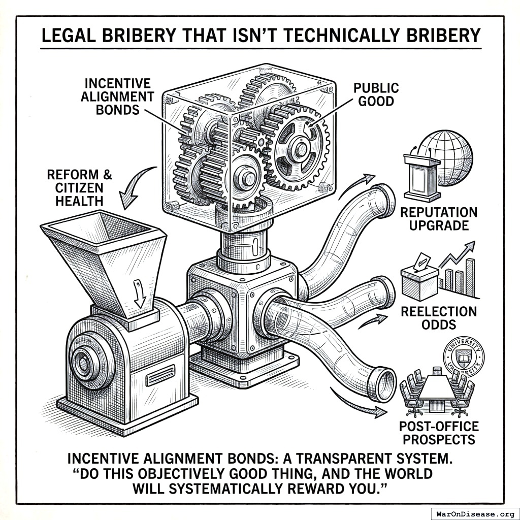 The fix: tell every politician on Earth, “Vote for a 1%-style reform and you get better reelection odds and a Goldman Sachs board seat when you retire.” No backroom deals. No suitcases of cash. Just a standing, public rule: do the objectively good thing, and the world systematically rewards you. Nobody has to become a better person. The money just circulates until diseases stop existing.