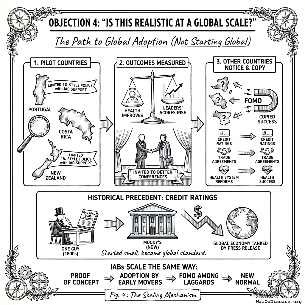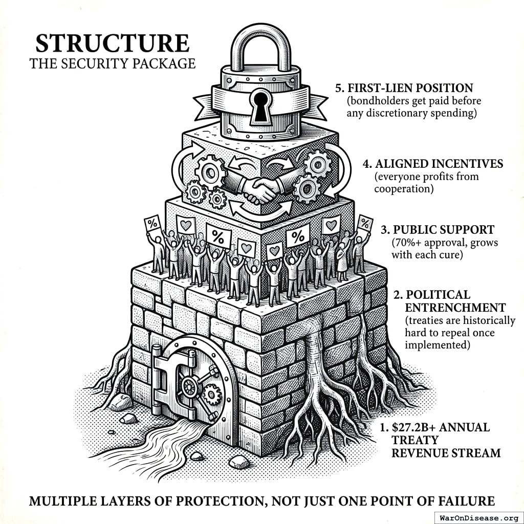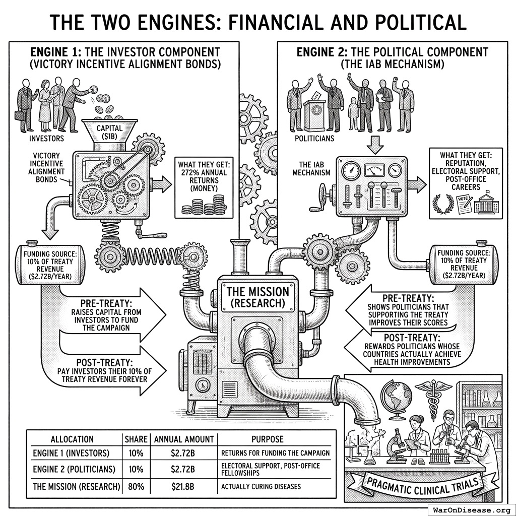 IABs break the loop. Investors give money and get money back (10% revenue share). That’s it. They don’t decide which diseases get funded. Politicians get career incentives (10%). They don’t touch the research budget. The remaining 80% flows to clinical trials via wishocratic allocation, controlled by direct democracy, not by the people who paid for it. The corruption is capped at 20%, transparent, and completely separated from the public goods funding. Name a government budget that can say the same.