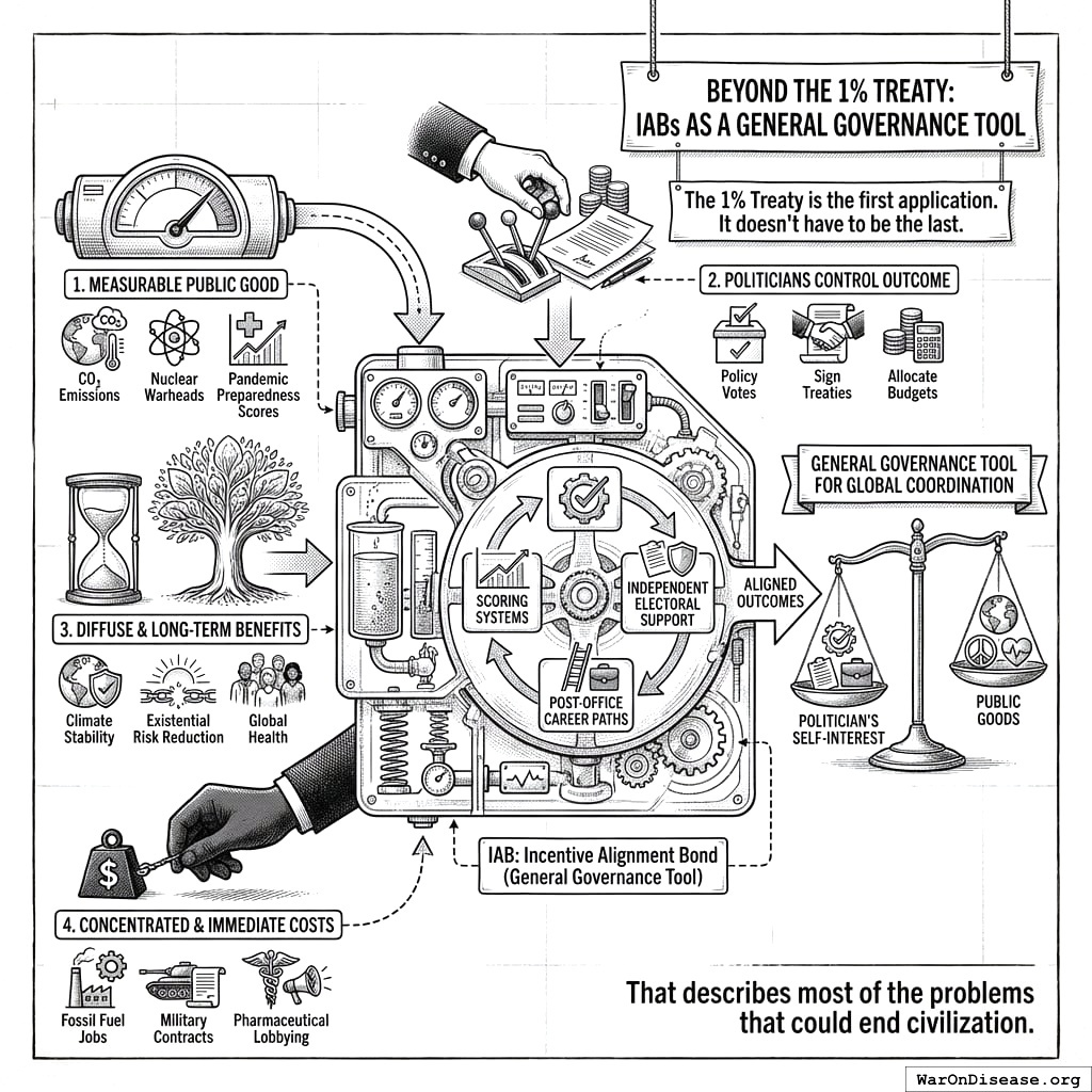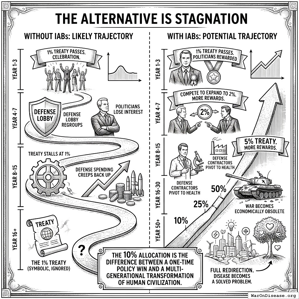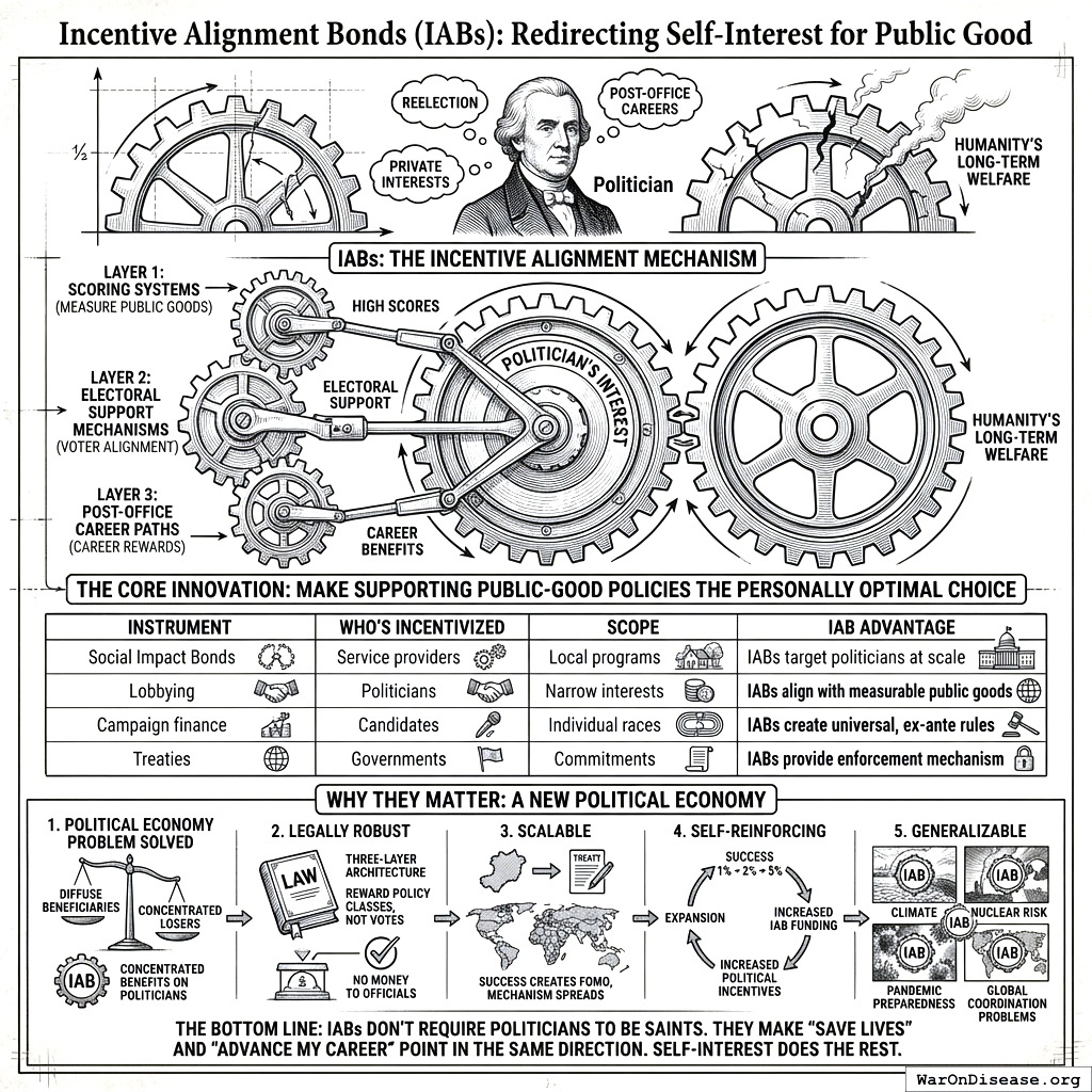 Bribery corrupts alignment. IABs create it. Wealthy actors already buy policy (pharma spends $300M/year on lobbying, weapons manufacturers spend $127M/year). The question isn’t “should money influence policy?” but “can you point the money at welfare instead of warfare?”