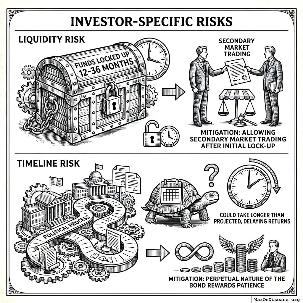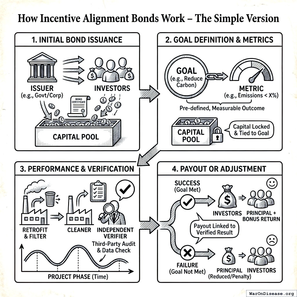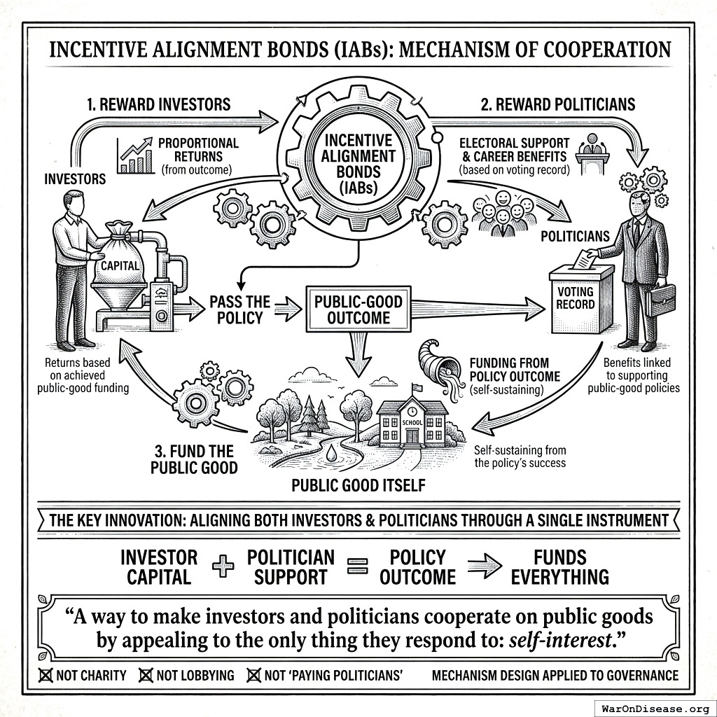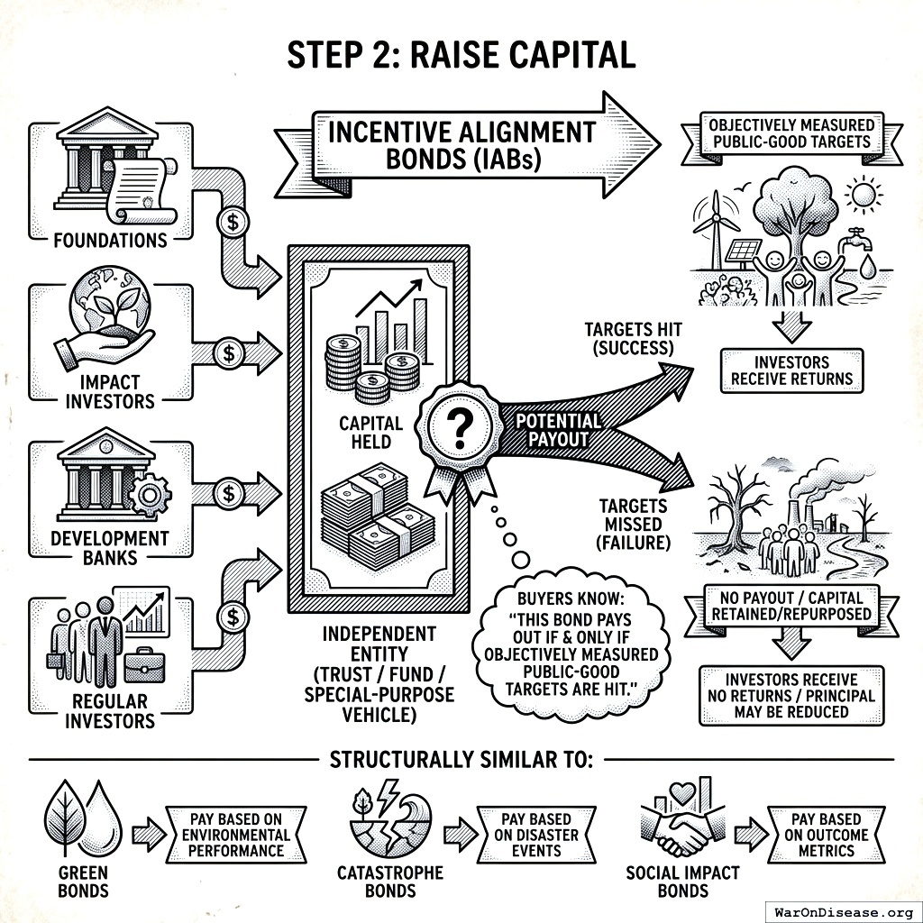 Investors buy IABs. Capital sits in a trust. It pays out if and only if public-good targets are hit. Same structure as green bonds and catastrophe bonds.