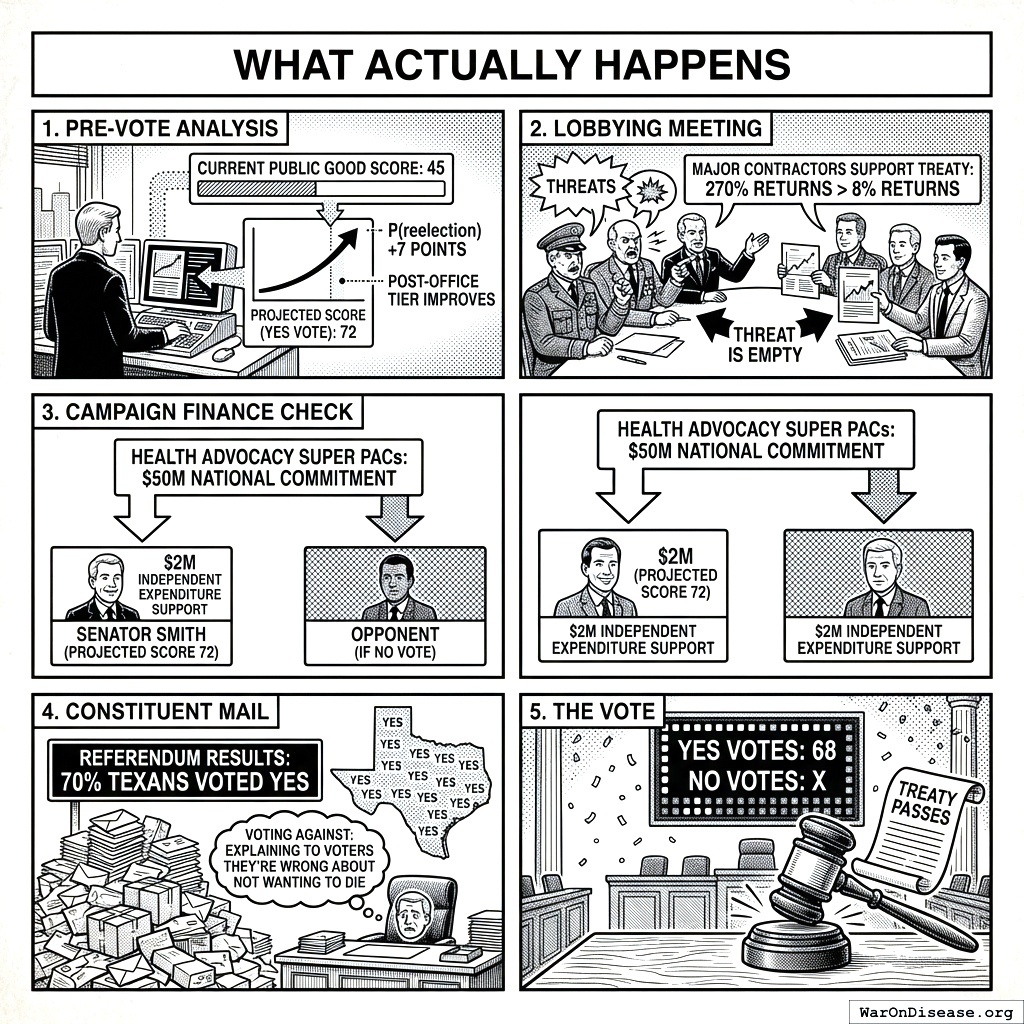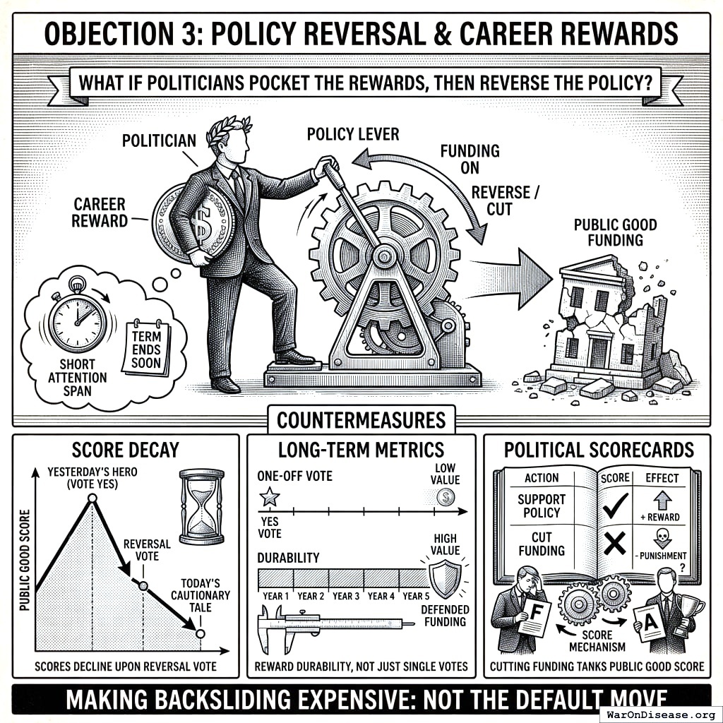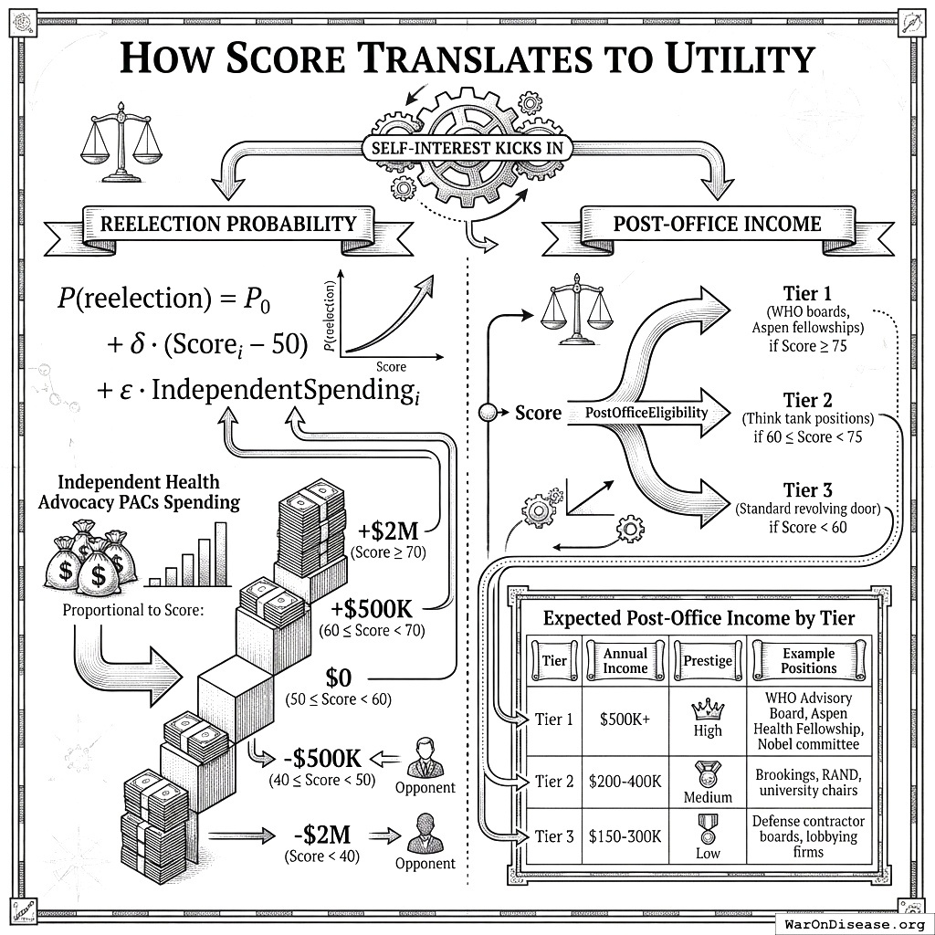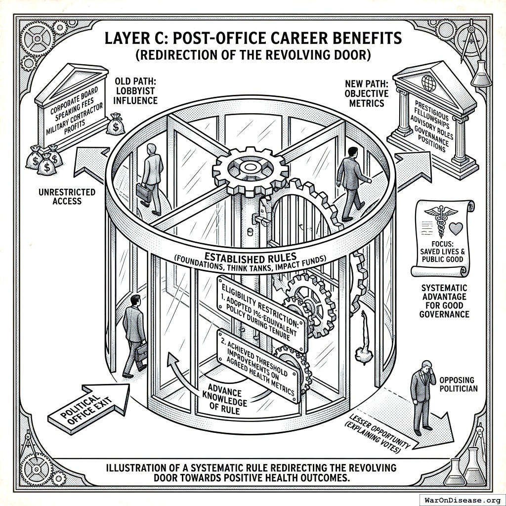Foundations and think tanks set eligibility rules: Public Good Score above X gets you WHO boards and Aspen fellowships. Below X, you’re explaining at dinner why you voted against curing diseases. The revolving door, but spinning toward “saved lives” instead of toward whoever paid the most lobbyists.