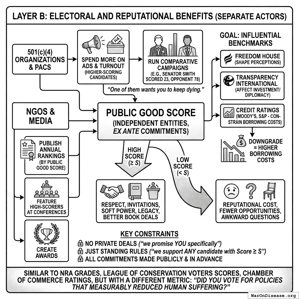 Independent PACs and 501(c)(4)s commit in advance to favor high-scoring politicians. The goal: make the Public Good Score as influential as Moody’s credit ratings or NRA grades. Moody’s can downgrade a country and suddenly borrowing costs spike. NRA grades already determine which politicians get funded. Same gun, different target.
