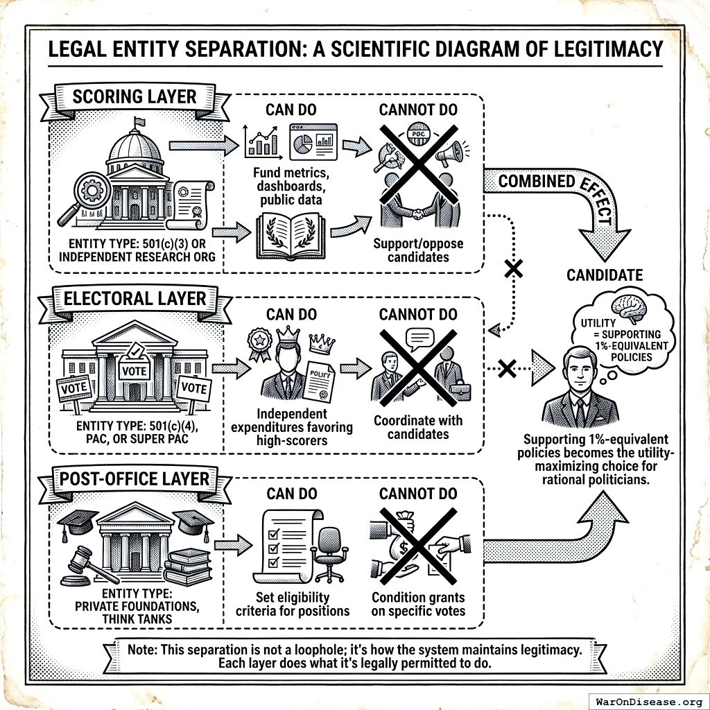 Here’s what makes this structurally different from current lobbying: in the current system, money and influence are inseparable. Give money, get influence over where the money goes, use that to get more money. The loop is opaque and self-reinforcing.