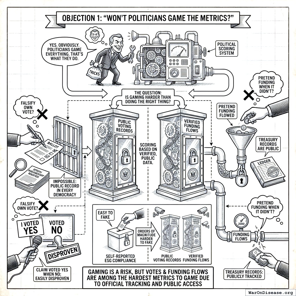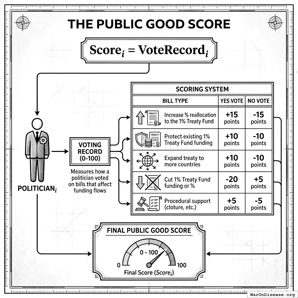 An independent org assigns each politician a Public Good Score based on votes, sponsorship, and funding flows. Scores cover a policy class (any >=1% military-to-health reallocation), not a specific bill. Public, rules-based, non-partisan. In the 1% Treaty materials, this domain-specific implementation is called the Treaty Support Score. (See the Senator Smith example for how scores translate to concrete payoffs.)