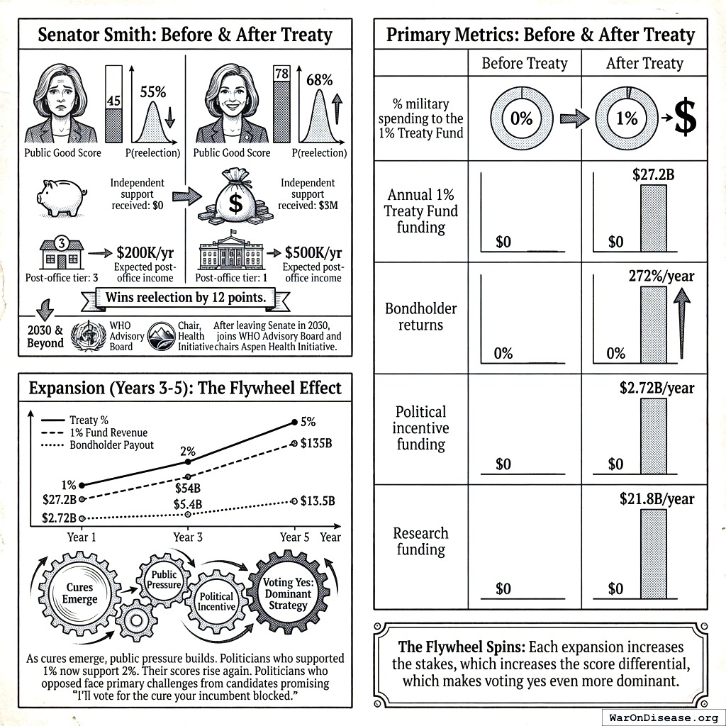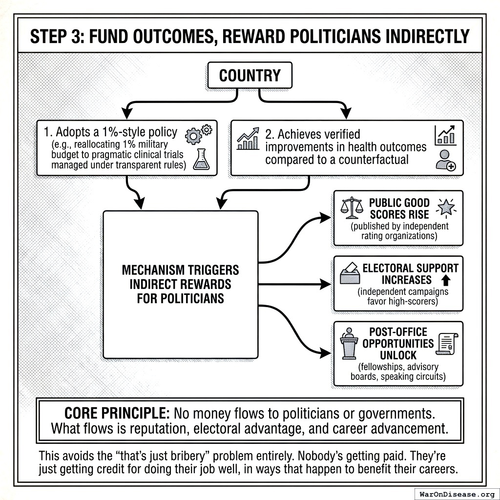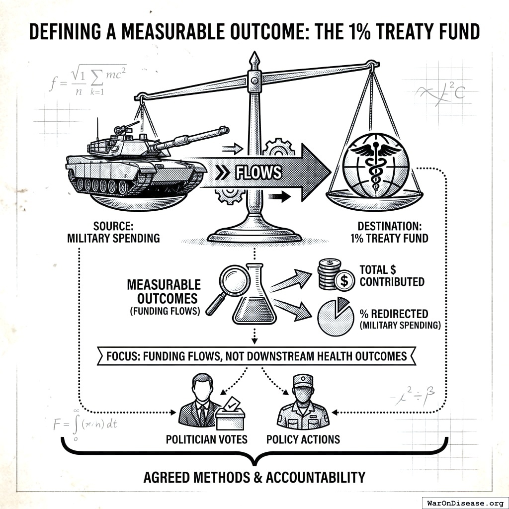 Measure funding flows, not health outcomes. You can’t attribute a treatment breakthrough to any single country’s funding. But you CAN measure: % of military spending redirected, total $ contributed, and politician votes on treaty passage. Health improvements justify the policy. Funding flows are the scoreboard, because that’s what politicians actually control.
