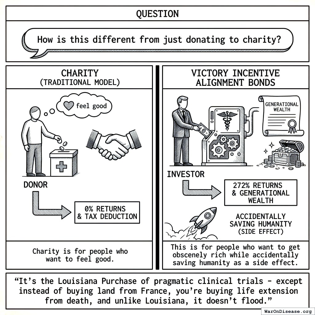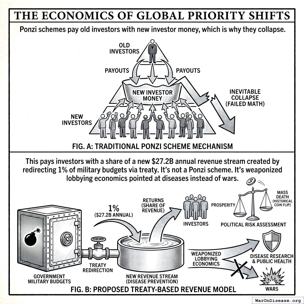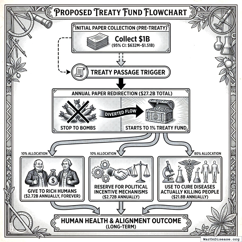10.5281/zenodo.18161560 6.65 thousand diseases have zero FDA-approved treatments; at current trial capacity, exploring them takes 443 years. Redirecting 1% of military spending scales capacity 12.3x, cutting the timeline to 36 years and preventing 10.7 billion deaths. At $0.00177/DALY, 50.3kx more cost-effective than the best existing interventions. Incentive Alignment Bonds make adoption politically viable.