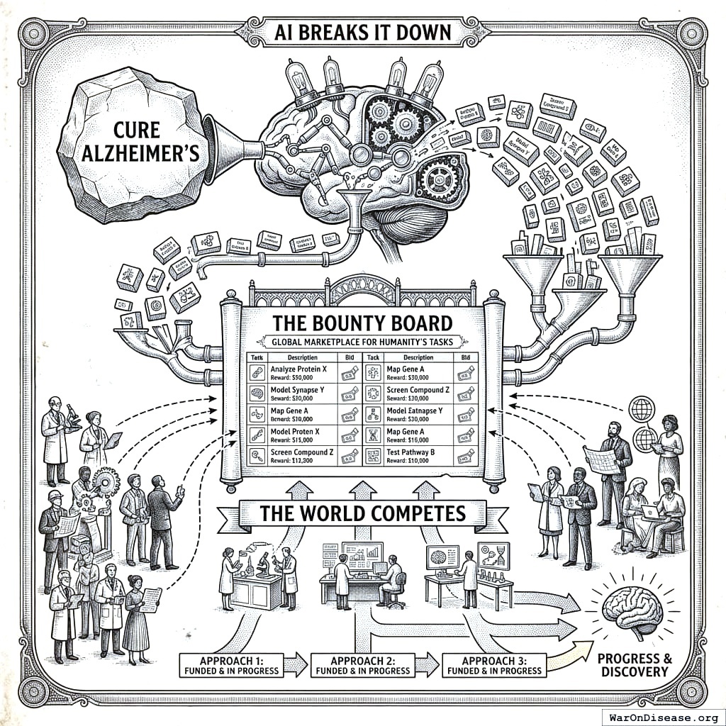 3. The World Competes: The best teams from around the world, from MIT to some kid in a garage in Lagos, bid on these tasks. The system funds multiple approaches in parallel. The ones that show promise get more funding. The ones that fail lose funding instantly. It’s venture capital, but for public goods. Your species already uses this method to decide which restaurants survive and which phone apps get downloaded. Time to try it with the things you keep pretending are too important for competition.