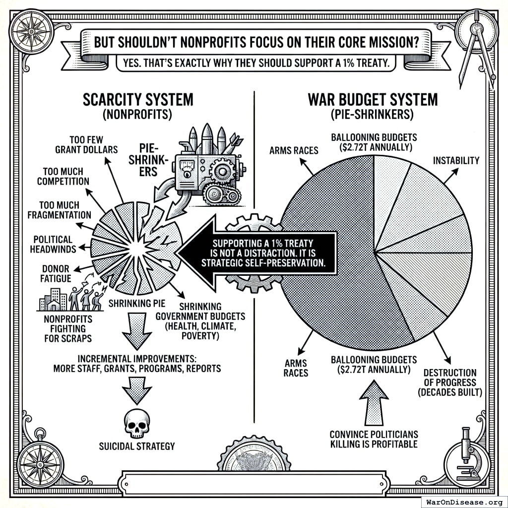Every nonprofit today operates inside a system that guarantees their failure. Too few grant dollars. Too much competition for those dollars. Shrinking government budgets for health, climate, and poverty. Ballooning budgets for war. Donor fatigue (your donors are tired because you keep asking them for money to do things that don’t work because you don’t have enough money). And the people whose job is “convince politicians that killing is profitable” get $2.72T annually to make your job harder.