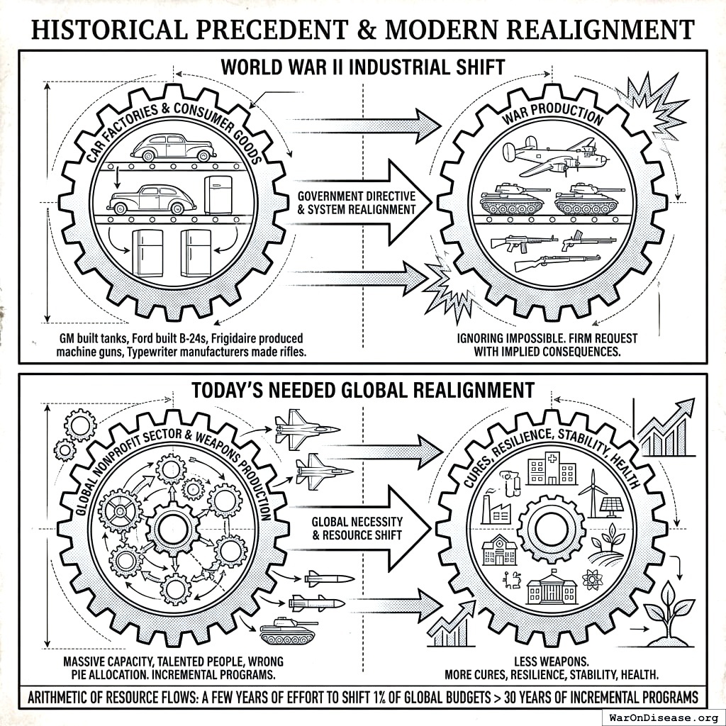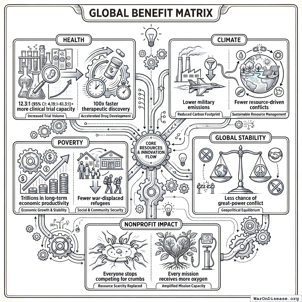 10.5281/zenodo.18161560 6.65 thousand diseases have zero FDA-approved treatments; at current trial capacity, exploring them takes 443 years. Redirecting 1% of military spending scales capacity 12.3x, cutting the timeline to 36 years and preventing 10.7 billion deaths. At $0.00177/DALY, 50.3kx more cost-effective than the best existing interventions. Incentive Alignment Bonds make adoption politically viable.