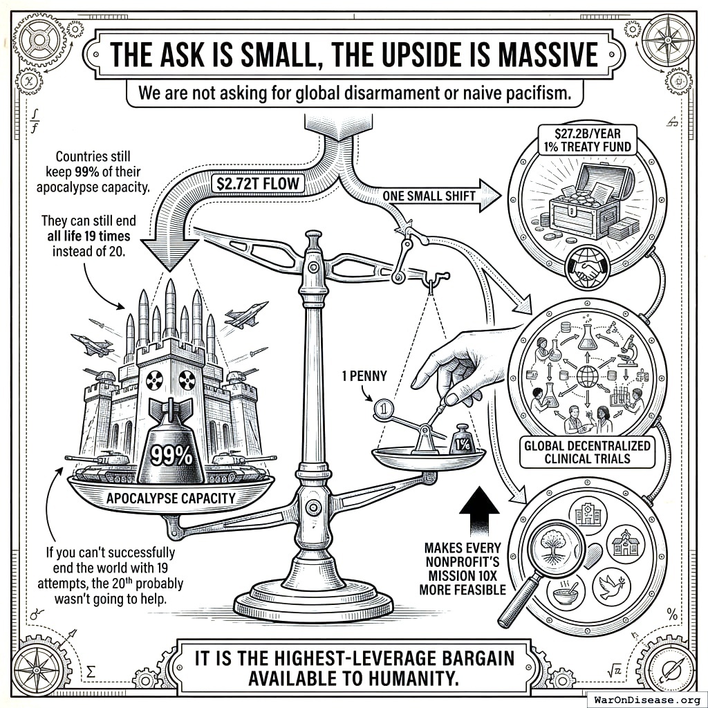 War is the root password to your worst problems. Redirect 1% of it, and every downstream mission gets easier. Increase it by 1%, and every mission becomes nearly impossible. This is not a peace movement. Nobody has to hold hands or sing songs or learn each other’s names. They just have to do arithmetic, which is the one thing your species is actually good at when it bothers to try.