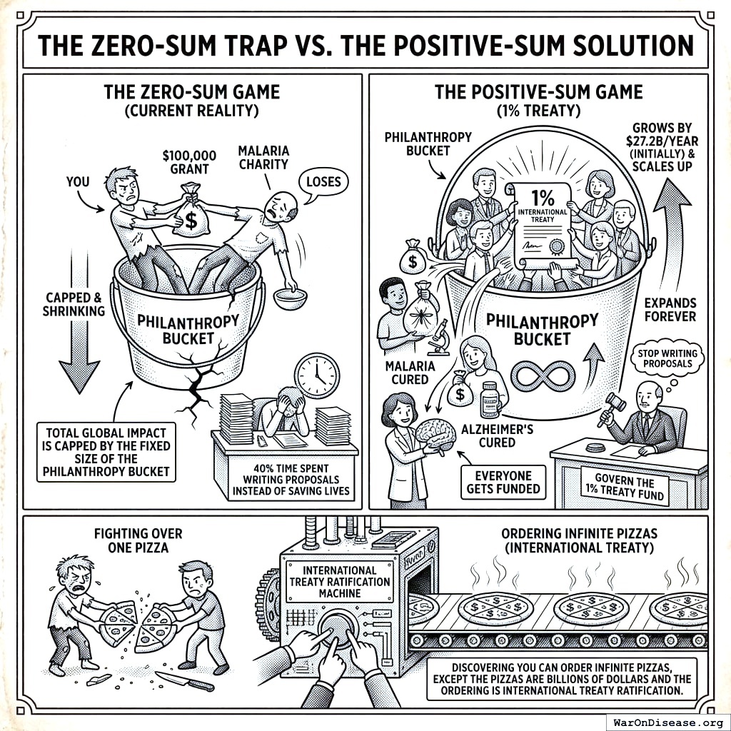 A 1% treaty turns this into a positive-sum game. $27.2B per year in new funding. Malaria gets cured AND Alzheimer’s gets cured. You stop writing proposals and start getting paid for results. This is like discovering that instead of fighting over one pizza, you can just order more pizzas than anyone can eat. Except the pizzas are billions of dollars and the ordering is international treaty ratification, which admittedly takes longer than calling Domino’s.