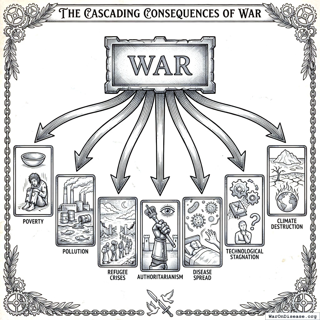 War is upstream of poverty (hard to build an economy when someone keeps blowing it up). War is upstream of pollution (militaries are among the largest polluters on Earth, which is ironic given they’re supposedly protecting it). War is upstream of refugee crises (humans whose homes were converted into craters need somewhere else to live). War is upstream of disease spread (bombs do not improve public health infrastructure). War is upstream of technological stagnation (yes, DARPA invented the internet; military R&D occasionally produces breakthroughs as a side effect of spectacular waste, the same way a forest fire occasionally clears space for new growth, but nobody calls an arsonist a gardener).
