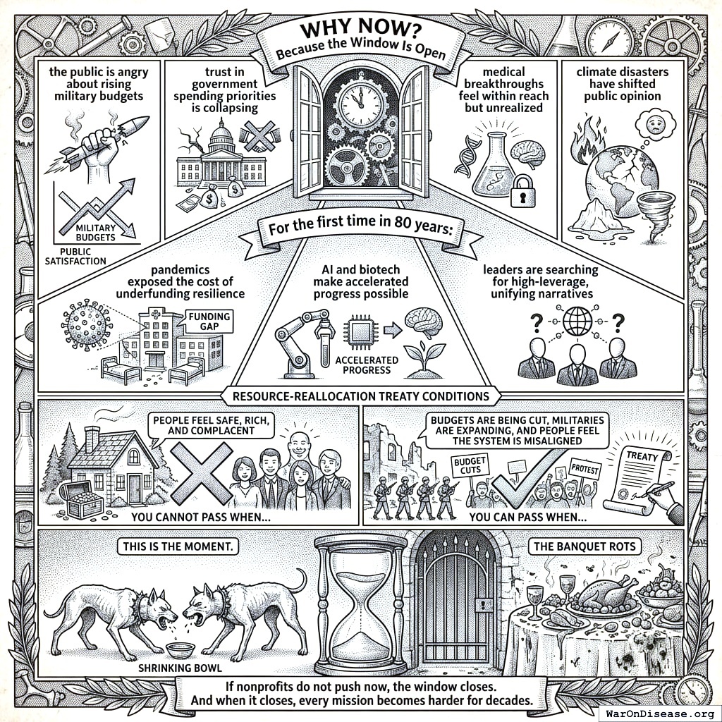 You have two options. Option A: keep competing for finite grants forever, writing proposals, begging foundations, hoping your competitor doesn’t write a better proposal. Option B: help pass the treaty, get paid referral bonuses for every verified referendum vote you drive, and watch $27.2B/year flow to your disease area. One involves begging. The other involves getting paid. On Wishonia, this would not require a chapter to explain. But your species is very attached to its suffering, so here we are.